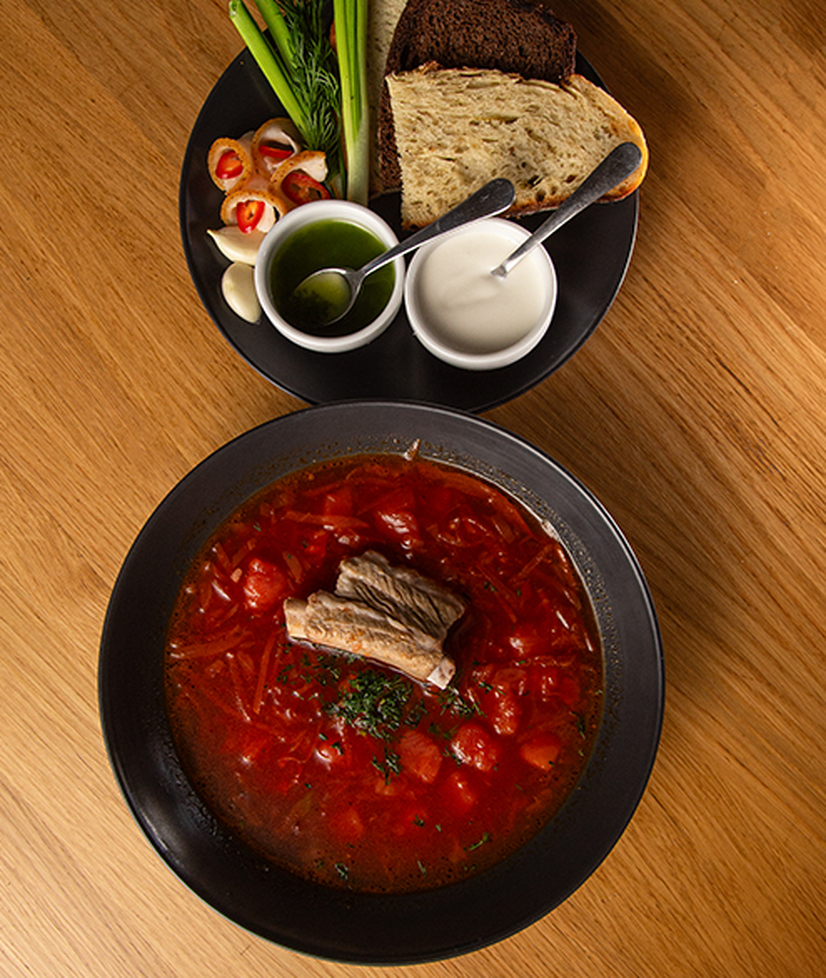 Навариситий бульйон з ребра свинини, картопля, морква, ріпчаста цибуля, червоний буряк, приправи, томати, подається зі сметаною та слабосолиним салом.