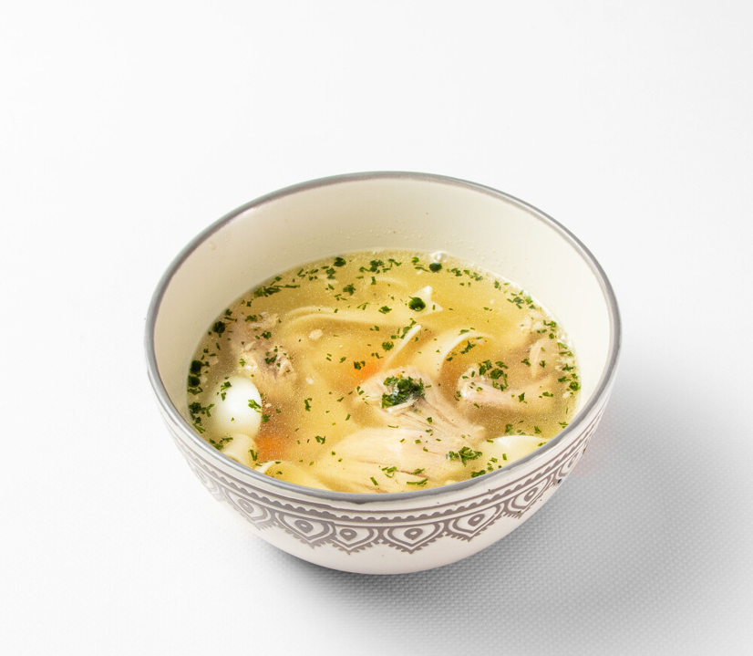 Наваристий курячий бульйон, куряче філе, морква, яйце перепелине, лапша, зелень.