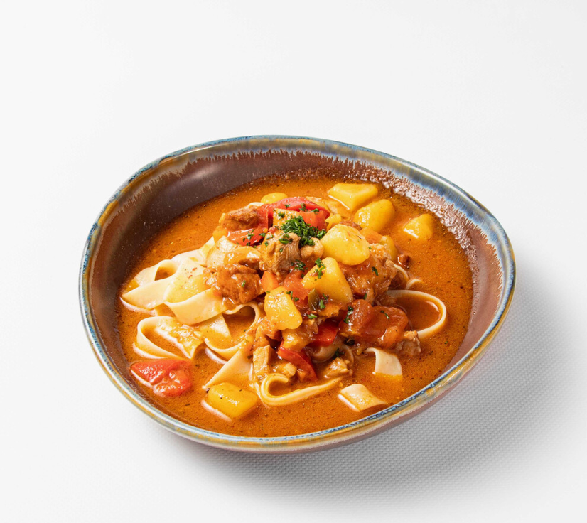 Лапша, курятина, картопля, морква, болгарський перець,ріпчаста цибуля, томати.