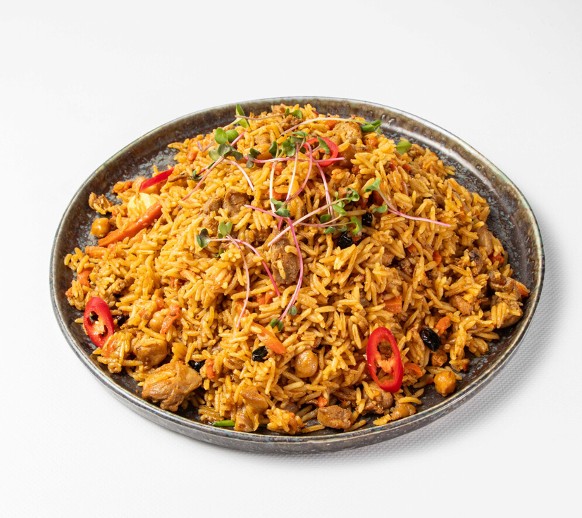Курятина, рис , олія рослинна, цибуля ріпчаста, морква, часник, спеції, аджика,барбарис.
